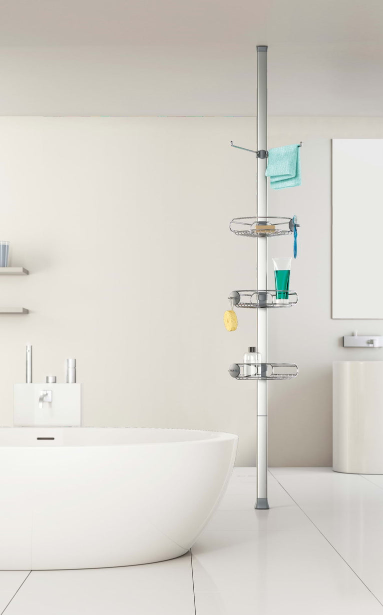 Fits securely between your floor and ceiling. Great for extra shower storage.