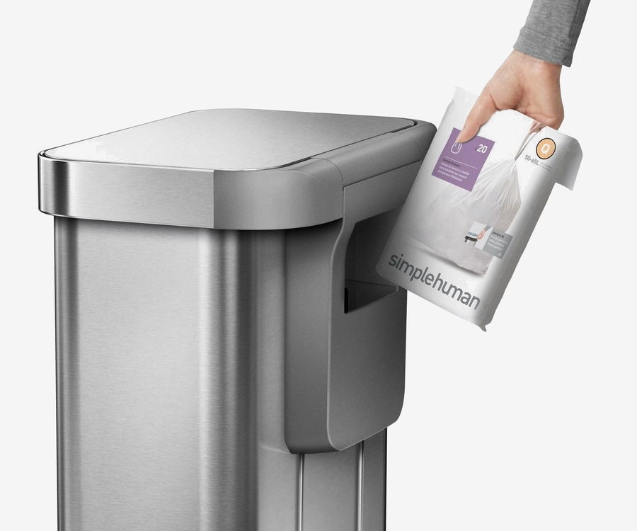 Store liners in the liner pocket, pull a fresh liner out from inside the can, and close the liner rim to hide the liner and keep it in place.