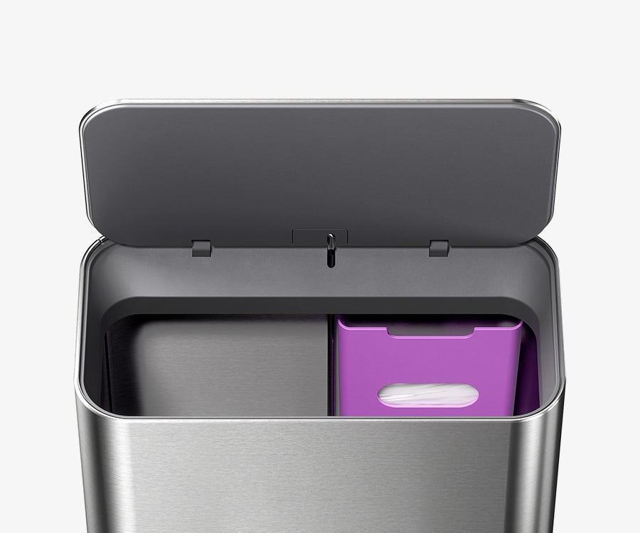 Made from 100% post-consumer recycled plastic, the inner bucket lifts out for quicker liner changes and easy cleaning.