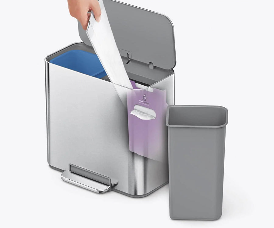 Made from 100% post-consumer recycled plastic, the inner buckets lift out for everyday disposal, quick liner changes and easy cleaning.