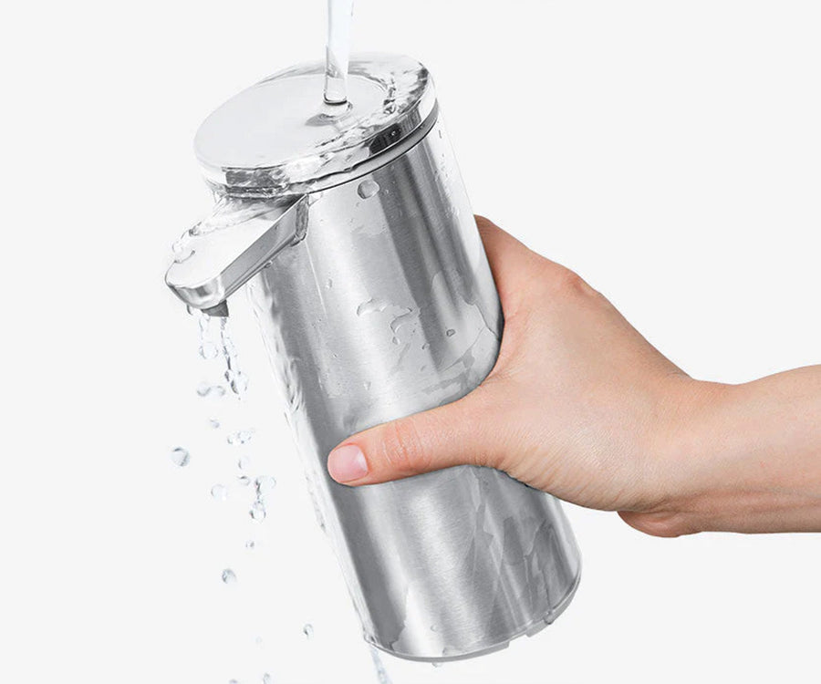 It's waterproof for easy cleaning. Just flip the off switch to prevent accidental dispensing and rinse it in the sink.