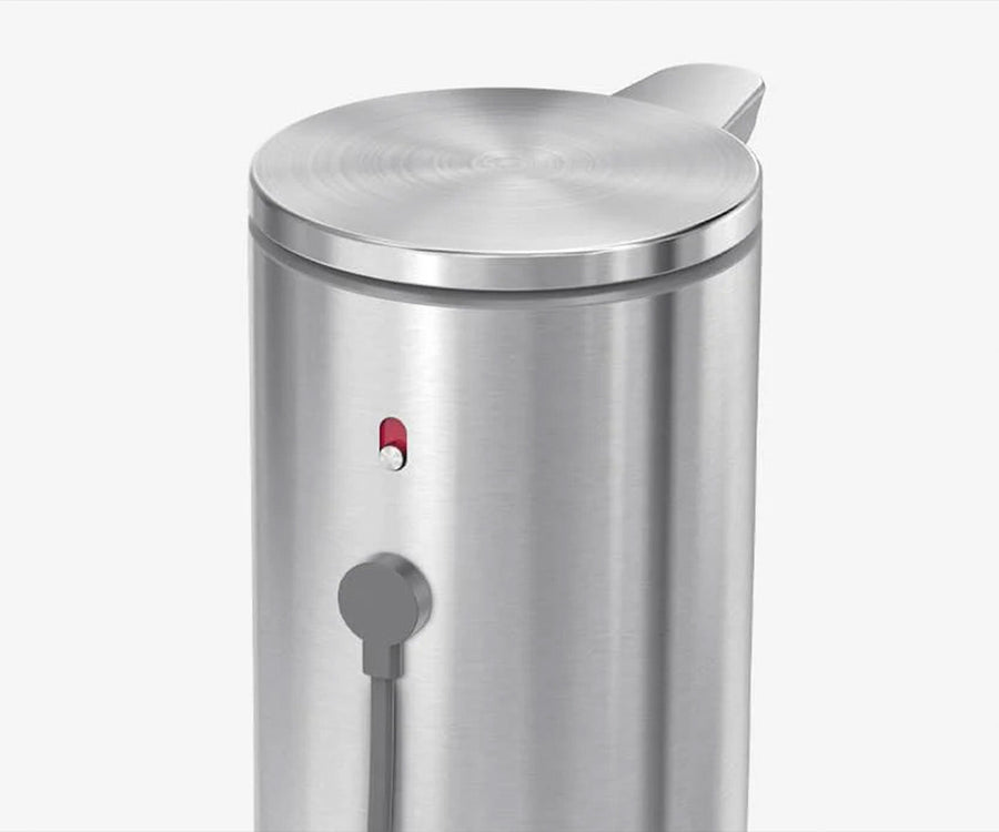 On/off switch facilitates easy cleaning without unexpected soap dispenses. Recharge plug on the back is easy to access, and one charge lasts 3 months.