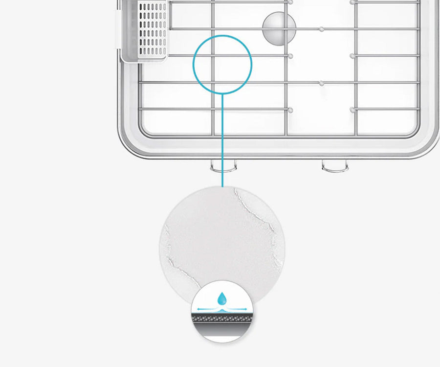 The inner plastic tray is designed for optimum draining with a hydrophilic coating that spreads water thinly across the surface for super-fast evaporation plus a central stainless steel drain that takes care of the rest — and it unscrews for easy cleaning!